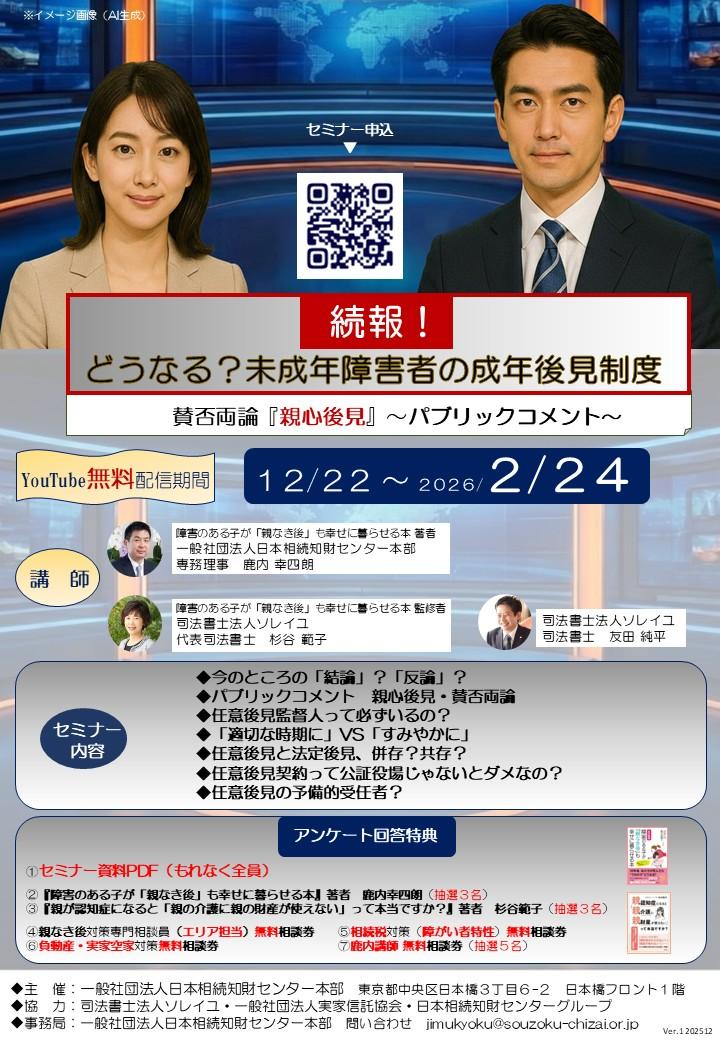 セミナー視聴後、アンケート回答した方に、次の特典があります。要チェック☝ アンケート回答〆切 2026年2月24日(木) ①もれなく全員:セミナー資料PDF ※アンケート回答後の自動返信メールに添付 ②鹿内講師サイン入り書籍(抽選3名様) https://amzn.asia/d/jerp8i4 ③杉谷司法書士サイン入り書籍(抽選3名様) https://amzn.asia/d/0ceUWV2 ④親なき後対策専門相談員(エリア担当)無料相談券 ⑤相続税対策(障がい者特性) 無料相談券 ⑥負動産・実家空家対策 無料相談券 ⑦鹿内講師(抽選5名)無料相談券 |